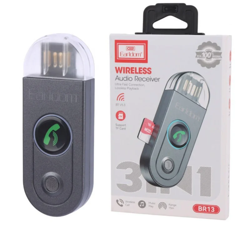 دانگل بلوتوث USB ارلدام (Earldom) مدل BR13 طراحی کوچک، شبیه فلش مموری و قابلیت حمل آسان امکان خواندن کارت حافظه TF و سازگاری با انواع دستگاه‌های مجهز به بلوتوث اتصال به ضبط ماشین یا اسپیکر از طریق USB و ایفای نقش گیرنده و فرستنده بلوتوث پشتیبانی از بلوتوث نسخه 5.3 با برد تا 15 متر و کیفیت صدای پایدار مخصوص پخش موسیقی و تماس صوتی دارای پورت جک 3.5 میلی‌متری برای اتصال گجت‌های AUX و مجهز به میکروفون داخلی جهت انتقال مکالمات