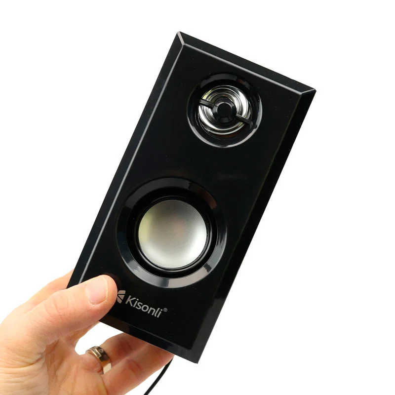 اسپیکر دسکتاپ Kisonli مدل T001 یک اسپیکر با طراحی دو تکه مناسب برای لپ تاپ و سیستم های خانگی جهت تماشای فیلم، سریال، گوش دادن به موسیقی و ... می باشد. این محصول از طریق رابط جک ۳٫۵ میلی متری صدا و پورت USB به کامپیوتر، لپ تاپ و دیگر دستگاه های سازگار متصل می شود. همچنین با توجه به ابعاد کوچک و جمع و جوری که دارد فضای زیادی از میز کار را اشغال نخواهد کرد و در حداقل فضا قابل راه اندازی و استفاده است. بلندگوهای اسپیکر دارای توان خروجی ۳ وات بوده که در مجموع ۶ وات خروجی را جهت پخش اصوات می می دهند. نسبت سیگنال به نویز این محصول ۶۰ دسی بل و دامنه فرکانسی آن ۹۰ هرتز تا ۲۰ هزار هرتز بوده که با توجه به مشخصات کلی و قیمت اقتصادی محصول می توان از کیفیت و وضوح صدای آن اطمینان کافی به دست آورد.