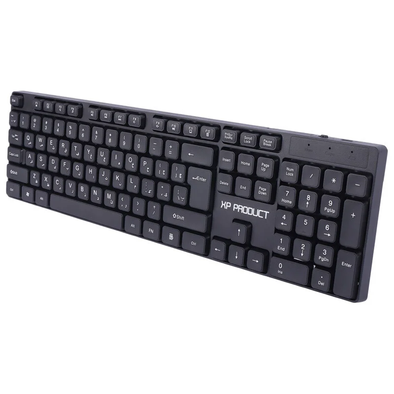 کیبورد مجهز به 104 عدد کلید فیزیکی با حروف حک شده فارسی، دارای نشانگر LED و پایه تنظیم ارتفاع